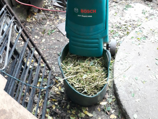 First we need to prepare the green and brown material to the right size: Where possible, we shred these to “bite” size, roughly 4x4 cm2 max, the smaller the better. For this we use mainly garden shears, pruning clippers and secateurs. In some instances, we also use a power shredder for larger volumes (typically for hedge trims). We have also used a lawn mower when the material is dry and does not contain thick stems (or these are first removed and cut with hand tools).