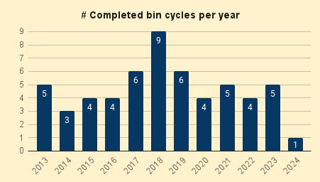 So whilst the input waste comes to the bins in continuous regular (near weekly) loads, the finished compost is collected a few times a year. The chart above shows the number of bin cycles completed on an annual basis.