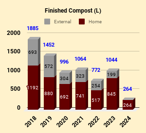 The long term FC annual average is ~1030L. The annual average for home compost is ~780L (and ~390L for other sources from 2017). This is a split of ⅔ and ⅓ between the two sources.