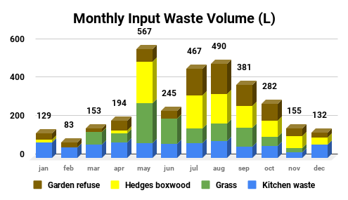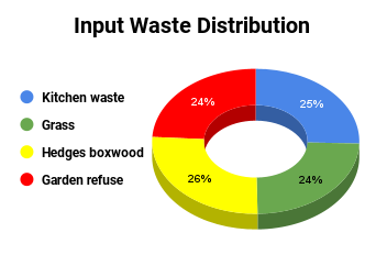 Broadly speaking, there are four key components of IW used in our compost lab. The pie chart below shows its breakdown. Kitchen waste makes up a ¼ of the total input; and the garden contributes ¾ roughly equally split between grass, hedge clippings and other garden material. These are the IW proportions measured since 2012.