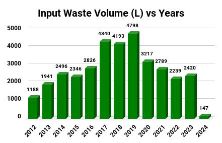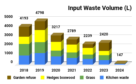 The period between 2017 to 2020 saw a peak of waste material used. The main differentiator being additional material coming from other sources; for example friends, family and neighbours. They learnt about our compost project and started to bring in additional material (mainly grass and hedge clippings). The Covid pandemic however has reduced the contribution from these sources. The long term IW annual median is ~ 2700L (average ~2900L).